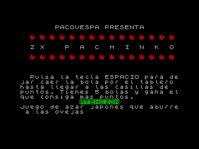 PACOVESPA has nailed Pachinko's essence though: a hypnotic, addictive game with zero player control, except instead of strobe lights, J-pop at 120 decibels, animated waifus and millions of balls thundering in a parlour where Japanese salarymen chase the dream of "this time it'll pay out", you're sat in sepulchral silence pressing SPACE five times watching a single ball crawl across a grid while your Spectrum hums, achieving the brain stimulation of counting sheep—which explains why the author admits it's a "Japanese game of chance that bores sheep".
